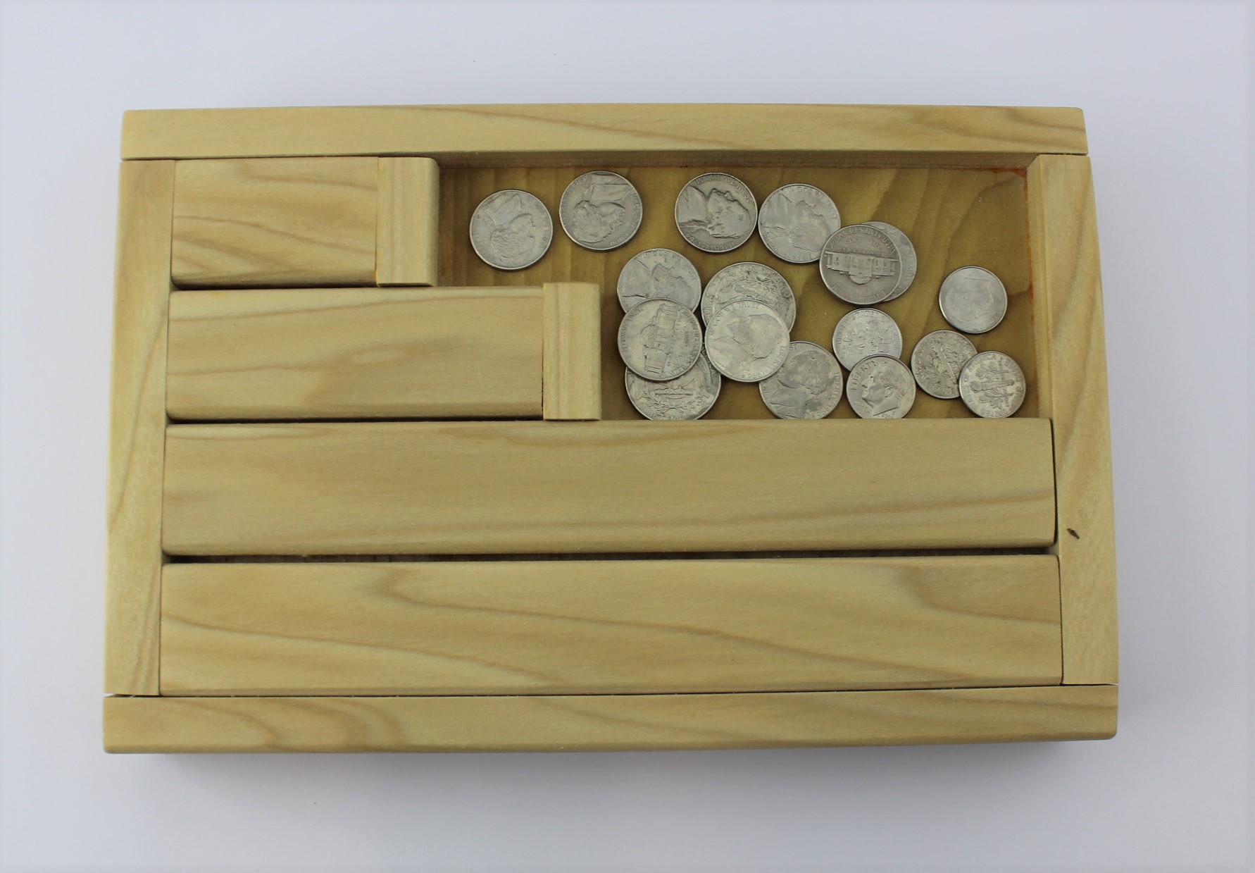 This is a versatile work that can be used on the practical life shelf as a finger transfer sorting work or it can be used to introduce money. It is designed to show three different ways of making 50 cents – with two quarters, five dimes, or ten nickels. The slots for the change are precisely the size of the coins that should fit in them. Nickels, being the thickest, will only fit in the long nickel slot. The dime slot is the thinnest and will only fit the dimes. The length of the three rows are precisely the length of the needed change end to end. Thus there is a control of error with this work.