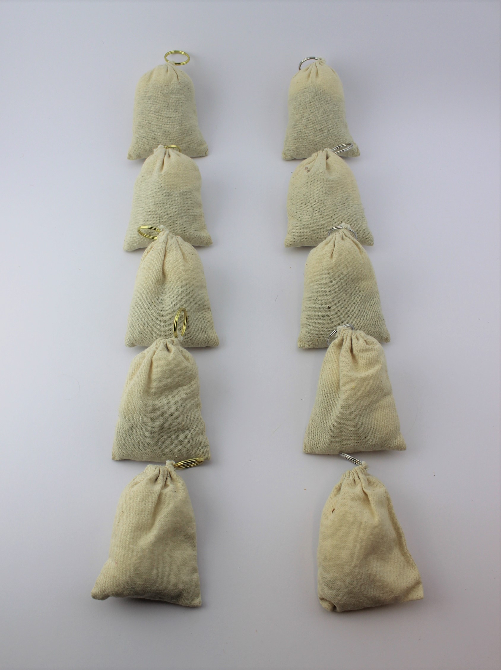 The weight bags supplement the baric tablets on the sensorial shelf by further refining the child’s tactile sense of weight. The materials consist of five pairs of small bags, with each pair weighing the same, while the five pairs have different weights. The bags weigh 20 grams, 60 grams, 100 grams, 140 grams, and 180 grams. The control of error in the work is that each bag has a pair and if two bags are incorrectly matched the last two bags will not match, requiring the work to be revisited. The bags have metal rings at the top of silver and gold allowing the child to hook a finger into the ring as a method of weighing them.